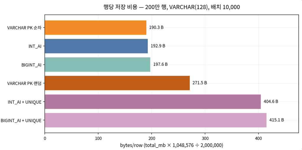 - VARCHAR PK 랜덤은 리프 중간 삽입·페이지 분할이 잦아져 같은 200만 행이어도 순차보다 물리 용량이 크게 잡힌다.