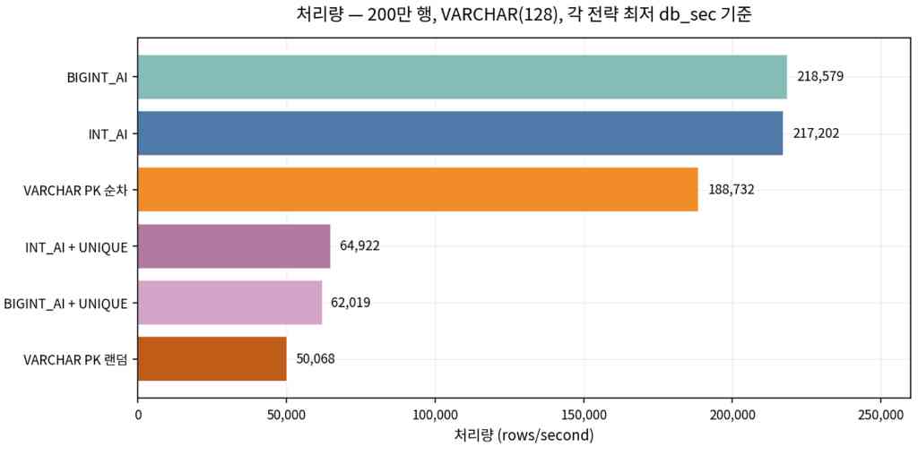 - PK를 Auto Increment로 두더라도 UNIQUE VARCHAR(N)커질수록 긴 문자열 유일성 인덱스 유지가 INSERT 경로를 무겁게 만든다.