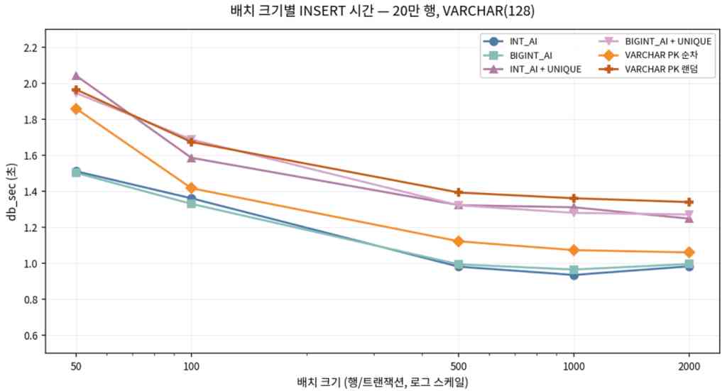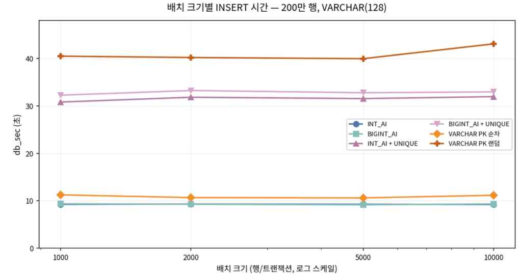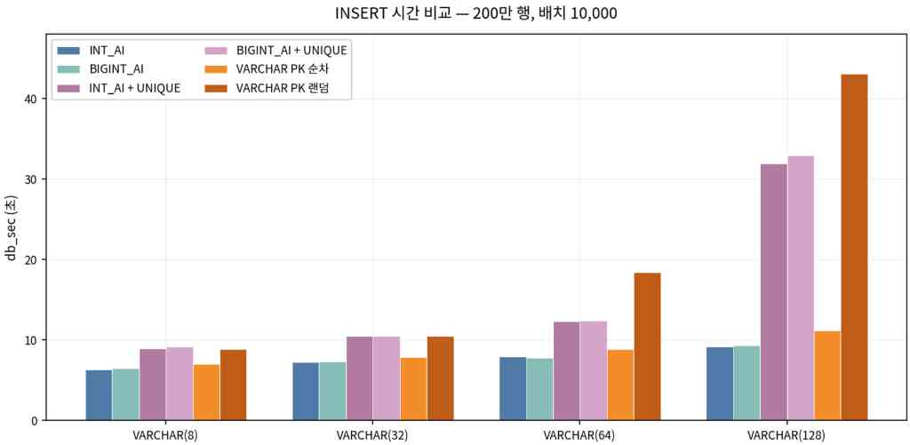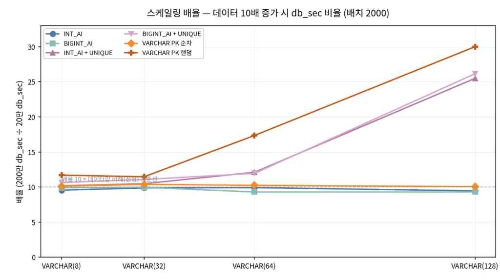 - PK 순차는 VARCHAR(N) 축이 바뀌어도 비율이 대략 10 근처에 머물러, 이 구간에서는 스케일링이 비교적 예측 가능하다.