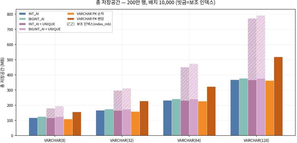 | VARCHAR 길이 | PK 전략 | 순차/랜덤 | db_sec | data_mb | index_mb | total_mb |
